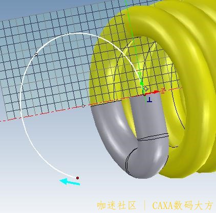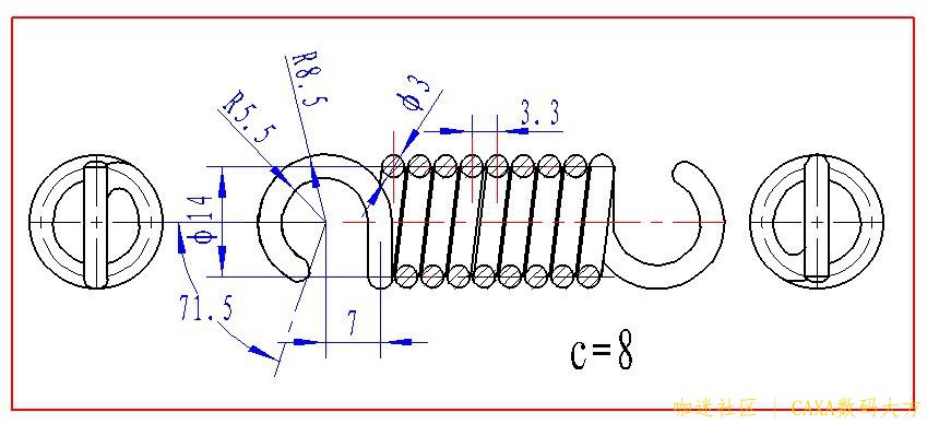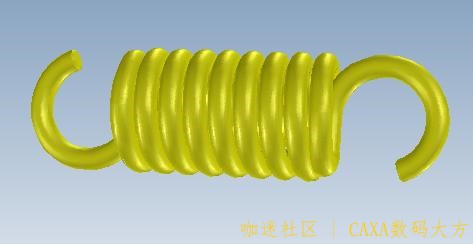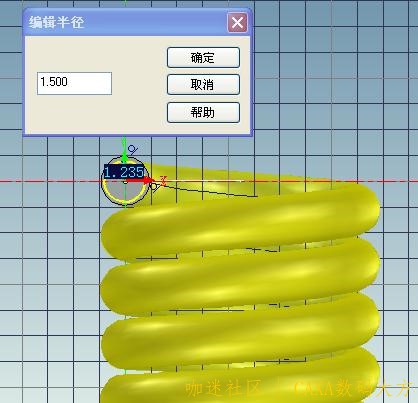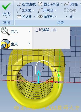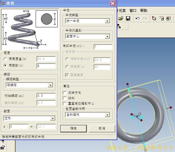 | 下面是通过弹簧工具和扫描功能绘制拉簧的过程: (此弹簧圈数c为整数倍) 1. 用“图素”“工具”中弹簧“加载”取如下参数,确定。 2. 用“扫描向导”,对簧丝端面按图纸尺寸画扫描线,如下图“完成” 3. 再编辑端面半径为1.5的园,确定 4. “完成”得下图 5. 再用“扫描向导”点端面,但对栅格应用“三维球”使其转动90º,按图尺寸画簧钩。“完成”。 6. 同步驺3再画R1.5园,“完成”。 |