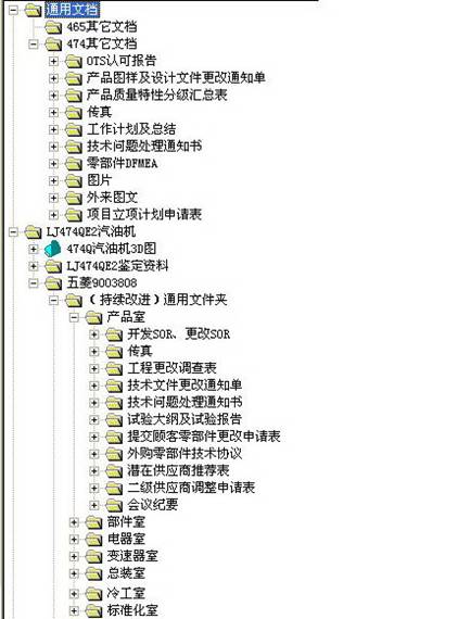 五菱柳机的业务模式主要是根据不同汽车厂商的需求,在公司现有的465和474两个主系列产品的基础上进行改型设计,技术开发部现有职能科室8个,不同的岗位27个,技术人员将近120人。首先,如何让技术开发部图纸和各种技术文档时时共享,有效借用原有图纸进行快速的改型设计,一直是部门领导困惑的问题;其次,每个产品的零件有6000~7000个,图纸的数量非常大,如何对图纸进行有效的管理是技术部的一大难题;第三,每个产品有80%的零部件外协采购,只有关键的零部件自己设计生产加工,而这部分零件或者某一个零件是整个产品的核心技术,图纸的保密性是整个产品生命的重要问题。