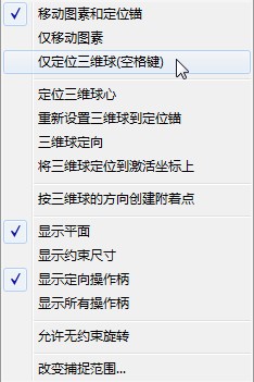 三维球有附着和脱离两种状态。 蓝色附着状态表示对三维球所附着的三维对象进行操作,包括对象平移、旋转、镜像、拷贝、阵列并为各种复杂三维变换提供了灵活、精确定向、定位方法。 白色脱离状态表示仅对三维球本身操作,重新设定三维球在对象上的位置和方向。 如何切换三维球的两种状态(蓝色附着和白色脱离)? 方法一:按空格键切换三维球的两种状态 方法二:右键点击三维球选择“仅定位三维球(空格键)”,如下图所示 |