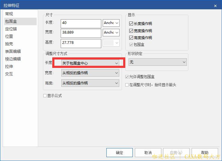 方法一:按住Ctrl键吧对称的两个手柄同时选中编辑即可; 方法二:右键点击一个智能手柄选择编辑包围盒,不编辑这个手柄方向的数字而编辑其他两个方向的数值,这两个方向就是双向对称拖放; 方法三:在智能图素状态点击右键选择“智能图素属性”,在“包围盒”选项中更改“调整尺寸方式”为“关于包围盒中心”,这时再修改长度数值就是做对称修改了。 |