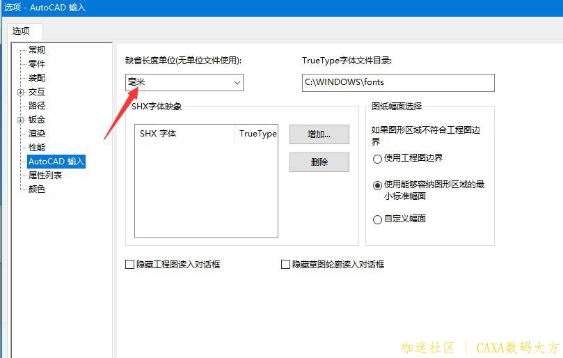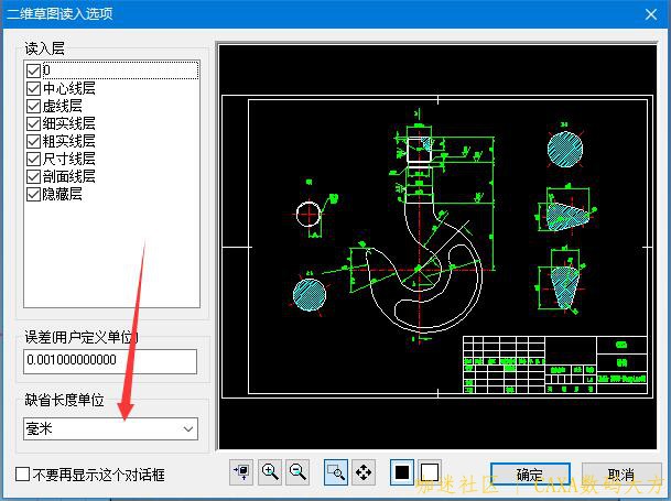 在草图中有时读入DWG文件时发现图形被放大了1000倍,这时由于读入的长度单位不正确造成的,可以用下面的方法解决: 方法一:在“AutoCAD输入”选项中设置正确的单位。 |