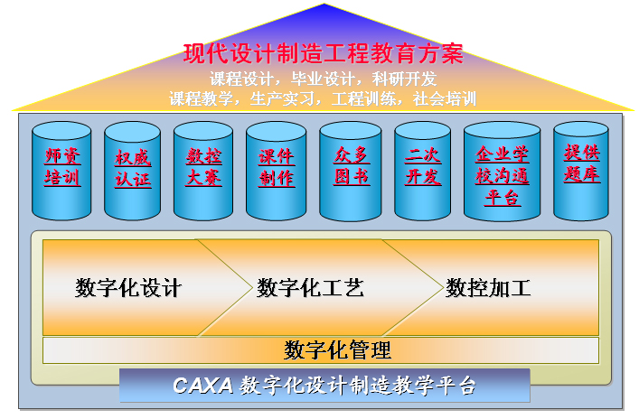 为适应当今教育形势的要求,CAXA在认真分析和总结六年来在教育培训方面的经验和不足的基础上,结合十多年来对中国制造业企业设计制造流程以及各工作岗位知识结构和技能要求深刻的认识和理解,推出了全新的CAXA数字化设计制造教学平台。为广大工科类院校提供了建立既符合现代企业实际应用模式,又能在院校教学环节中实现辅助教学功能的数字化设计制造教学平台,开创了为制造业培养高技能人才的全新模式,适应了制造业快速发展对人才需求新形势的要求。